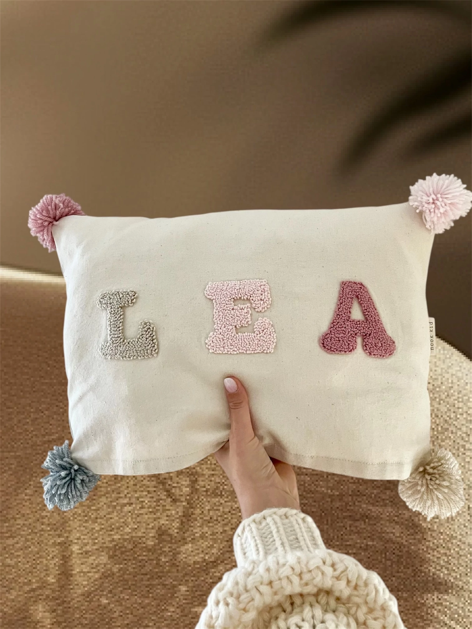 Ez a gyerekeknek készült, punch needle technikával kézzel hímzett párna tökéletes választás a kicsik számára! Személyre szabható név miatt igazán különleges kiegészítő lehet a gyerekszobában.